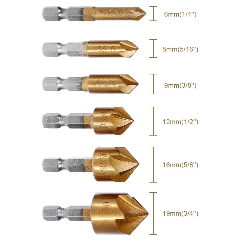 3/6Pcs Зенковка сверло 1/4'' Шестигранник HSS 5 Режущие кромки 90 градусов, деревянный фаскорез 6mm-19mm.